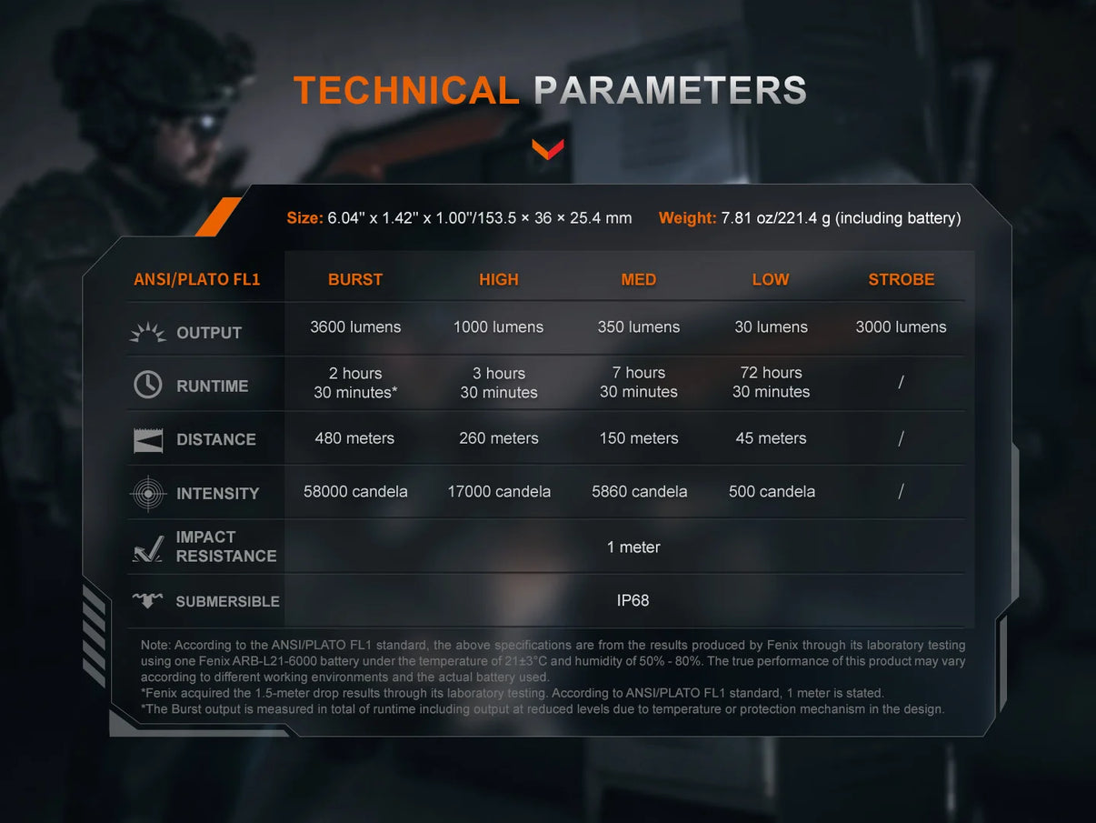 La Fenix TK21R est usinée en aluminium aéronautique avec une anodisation dure HAIII. Elle est certifiée IP68, résistante à l’eau, à la poussière et aux chocs du quotidien.