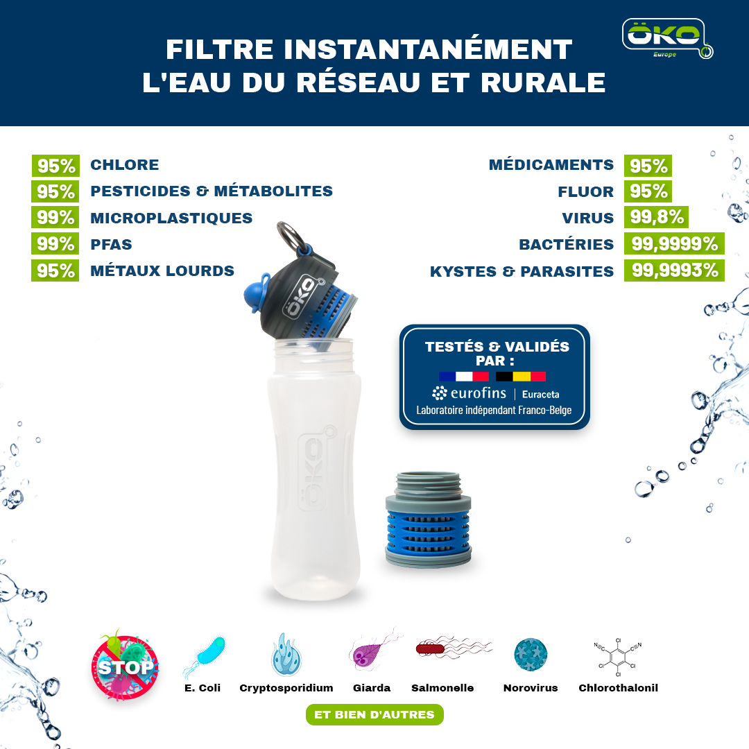 Technologie de filtration : membrane ÖKO™ de niveau 2 (capable de filtrer bactéries, protozoaires, chlore, métaux lourds et micro-particules)