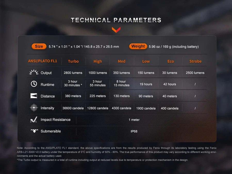 Elle intègre une LED Luminus SFT70 capable de délivrer jusqu’à 2800 lumens, avec une portée maximale de 380 mètres. La lampe fonctionne avec une batterie 21700 de 5000 mAh incluse, offrant jusqu’à 42 heures d’autonomie selon le mode choisi.