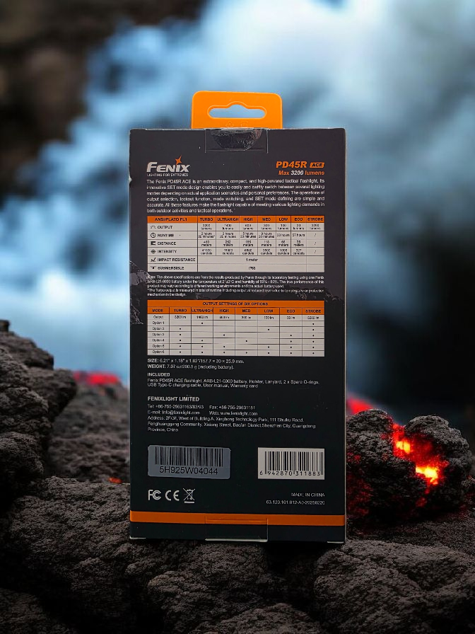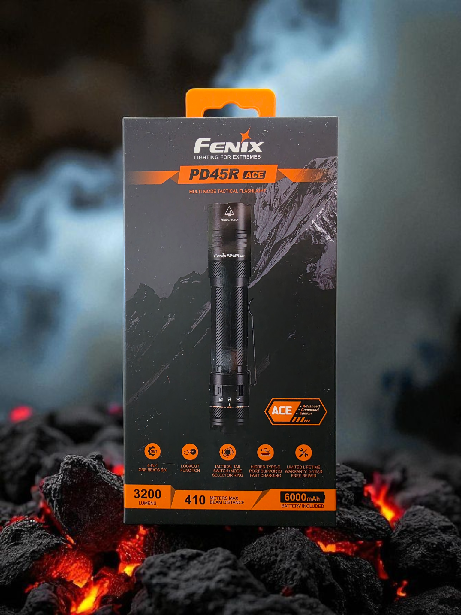 La Fenix PD45R ACE est une lampe de poche haut de gamme pensée pour les passionnés d’outdoor, les professionnels de terrain et ceux qui veulent une lampe fiable au quotidien. Avec ses 3 200 lumens et une portée de 410 mètres, elle allie puissance et polyvalence.